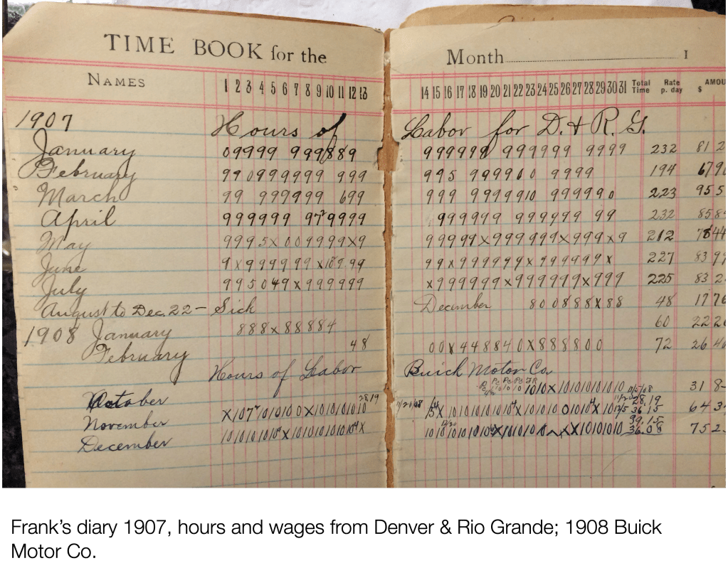 Doris’ father Frank McGlone kept journals, beginning in 1886, and through good fortune many of the yearly volumes were passed down to his daughter. They told of his farming and railroading life in the rural Midwest and his intermittent work in industry during Mark Twain’s Gilded Age, the post-Civil-War era of materialistic excess and political corruption accompanying the growth of industry and westward expansion. They chronicle a few years Frank spent as a lay minister for the Moody Bible Institute, and conclude with his employment in the newly-formed General Motors colossus. Frank and his sons built the automobiles that made Flint, Michigan the Vehicle City, made the paints that covered the cars, and helped start the passenger airline industry in Chicago.