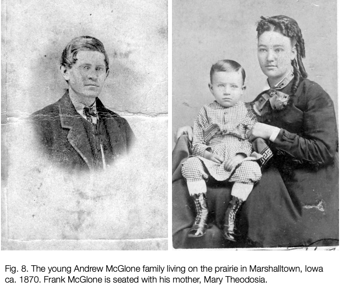 The young Andrew McGlone family living on the prairie in Marshalltown, Iowa ca. 1870. Frank McGlone is seated with his mother, Mary Theodosia.