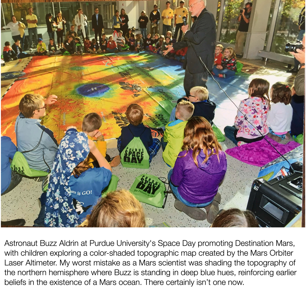 Astronaut Buzz Aldrin at Purdue University’s Space Day promoting Destination Mars, with children exploring a color-shaded topographic map created by the Mars Orbiter Laser Altimeter. My worst mistake as a Mars scientist was to shade the topography of the northern hemisphere where Buzz is standing in deep blue hues, reinforcing earlier beliefs in the existence of a Mars ocean. There certainly isn’t one now.