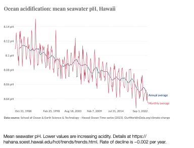 Mean seawater pH. Lower values are increasing acidity. (Replace with vector file seawater-ph.svg) Details at https://hahana.soest.hawaii.edu/hot/trends/trends.html. Rate of decline is ~0.002 per year.