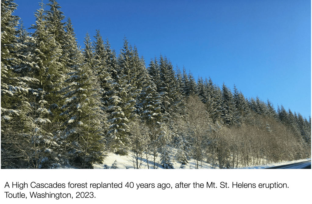 A High Cascades forest replanted 40 years ago, after the Mt. St. Helens eruption. Toutle, Washington, 2023.