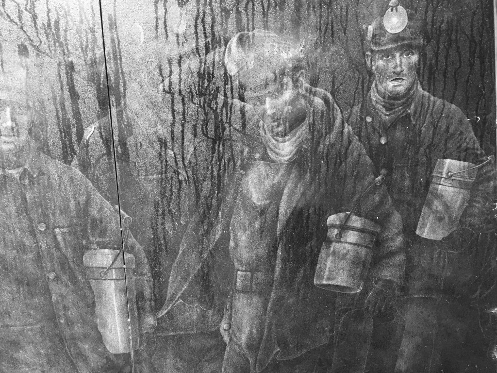 Memorial to Welsh and Slavic men who died in the coal mines. Glass and granite sculpture, 2006, of miners emerging from Mine No. 6, Vintondale, PA, along the Ghost Town Trail.